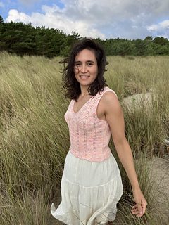 The top is worked in 2 pieces. The front and the back are worked separately and joined with three needle bind-offs at the shoulders. The two pieces are different from each other and have a different neck depth, which means that it is reversible when wearing. The top features an easy but beautiful lace pattern with half twisted ribbing on the front and on the back. It is framed with i-cord edges. The yarn has a very pretty drape which matches the boxy fit of the top, but with a feminine touch.