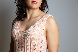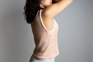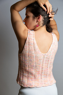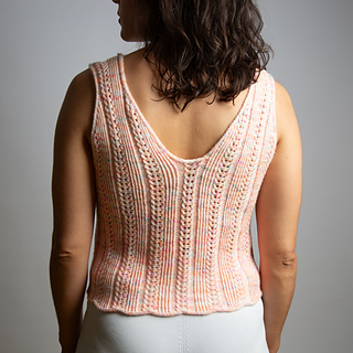 Das Design zeichnet sich durch ein einfaches, aber wunderschönes Lochmuster mit verschränktem Rippenmuster sowohl auf der Vorder- als auch auf der Rückseite aus. I-Cord-Kanten rahmen das Oberteil ein. Das Garn hat einen sehr schönen Fall, der perfekt zur kastigen Passform des Oberteils passt und ihm gleichzeitig eine feminine Note verleiht.