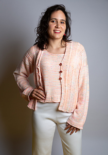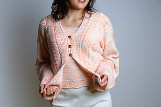 Le cardigan se travaille en parties séparées qui sont cousus ensemble à la fin. Les devants et le dos se tricotent séparemment et tricotées ensemble avec un rabattage à trois aiguilles aux épaules. Les épaules sont adaptées grâce à des rangs raccourcis. Les manches sont tombantes et tricotées du haut vers le bas en relevant des mailles au niveau des épaules. Le cardigan est embelli par un motif en dentelle et des côtes torses sur les devants et le dos. Il est encadrée par des finissions en i-cord. Le fil a un très beau drapé qui se mari parfaitement avec la coupe du cardigan qui se ferme avec 3 petits boutons sur le devant.