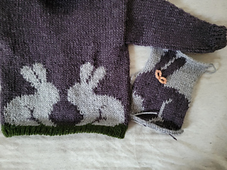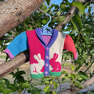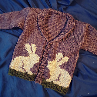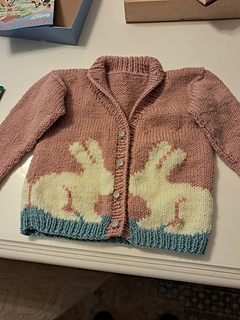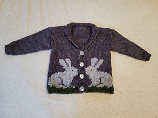 The Fluffle Cardigan is a drop shoulder children’s cardigan featuring an intarsia rabbit motif and optional shawl collar on a v-shaped neckline. The body pieces are knit flat from the bottom up. After these are seamed together, stitches are picked up for in-the-round sleeves and a ribbed button band/collar. Embroidery was used to add details such as eyes and blades of grass.