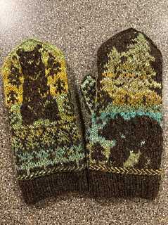 このミトンでは、森の中にたたずむツキノワグマを描きました。