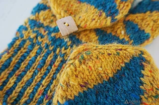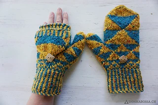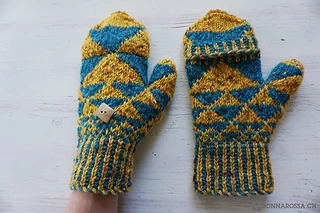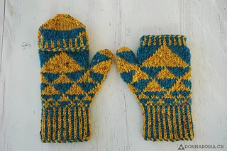 The mittens are worked bottom up. The two-coloured cast-on is continued by corrugated ribbing. The geometric Fair Isle motifs get bigger as the tip is reached. The mittens are worked seamlessly.