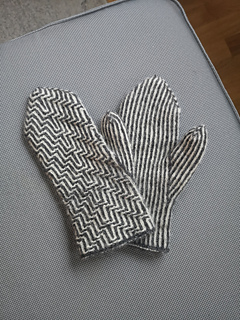 Tvåändsstickade vantar med mönster i flerfärgskrus.