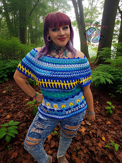 This is a measure along pattern, not graded, so there will be measuring and calculations to be done. You can use any yarn or fibre or hook you desire. There are instructions for adding sleeves and other ideas for modifications.