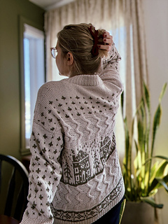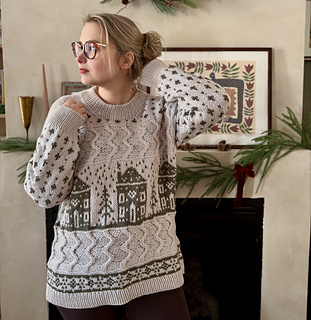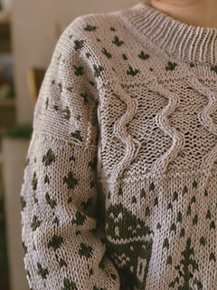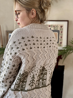 Wrap yourself in the comforting softness of a dreamy winter with this warm and cozy sweater. Knit in an oversized fit for absolute comfort, this design beautifully blends stranded colorwork and cables to create a unique, story-like atmosphere. The front of the sweater features a stylized little house nestled within the motif, from which rises a delicate cable that evokes chimney smoke dancing slowly in the cold air. Inspired by evenings spent by the fire, this snug design is perfect for embracing winter with both warmth and style.