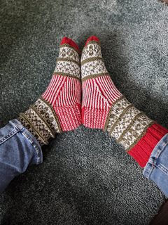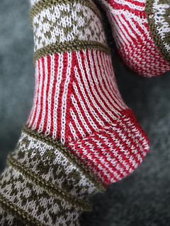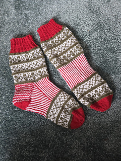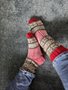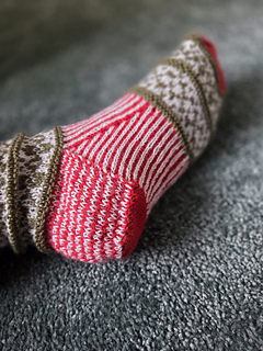 Het afgebeelde paar sokken is gebreid in Durable Soqs 318, 326 en 405, te weten Tomato, Ivory en Cypress. Om het paar te maken had ik van elke kleur 1 bol nodig, en hield garen over.