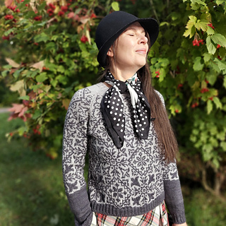 The idea for Ghali Sweater was to create a colourwork project that would go on forever. I find the stranded process very rewarding, almost like painting with yarn, and this sweater turned out pretty much as I imagined. It has a festive quality, not just because the original yarn includes sparkly stelina, but also because of the intricate colourwork motif that extends well past the sleeve separation with a 130-row chart and an option to turn it into an all-over colourwork sweater, too.