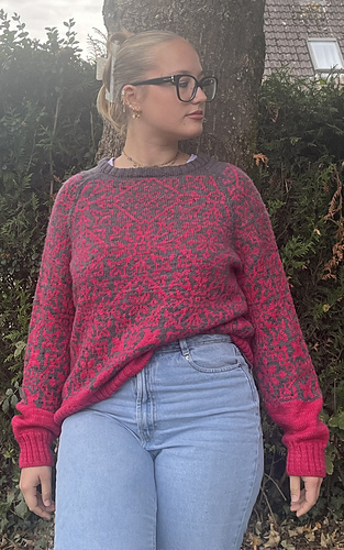 The rest of the yoke is worked in the round down to the underarms with continued raglan shaping. The body and sleeves are then separated. The body is knit in the round straight down to the hem and finished with a 2x2 rib. The sleeves are worked in the round with decreases down to the cuffs, also ending in a 2x2 rib.