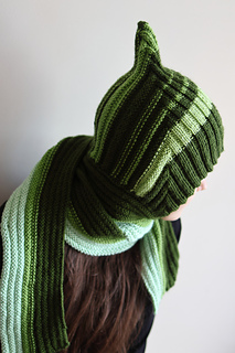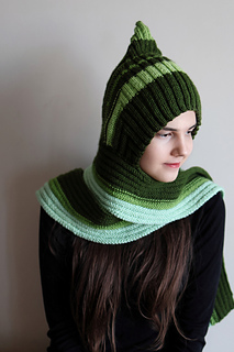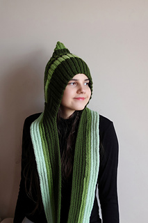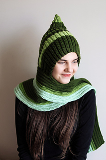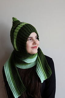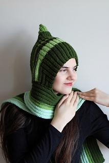 Pixie scarf balaclava in worsted weight with a sharp pointed crown and an integrated adjustable scarf in place of a button placket. Exceptional for scrappy and stash yarn. Knit flat throughout — no circular knitting required.