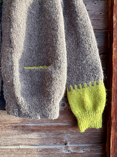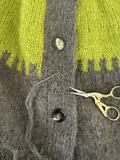 À la fin du yoke, les manches sont mises en attente et le corps est tricoté en intégrant les ouvertures de poches. Le bas du gilet est terminé par des côtes 1/1 en tricot combiné, également utilisées pour les poignets. La bande de boutonnage, large et structurée, est travaillée en jersey double.