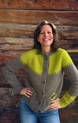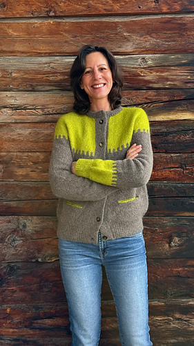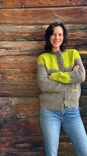 The GIANNA cardigan is knitted from the top down, in one piece and seamless. After a few short rows to shape the neckline, the yoke is worked using yoke-style increases, gradually forming the upper body and sleeves, while placing the mosaic colorwork pattern. At the end of the yoke, the sleeves are put on hold, and the body is knitted while incorporating the pocket openings. The bottom of the cardigan is finished with rib 1x1 in combination knitting, also used for the cuffs. The button band, wide and structured, is worked in double knitting. The folded collar, in rib 1x1, is knitted after picking up stitches around the neckline. The pockets, then the sleeves, are then resumed and knitted in the round, with or without colorwork pattern. The work is finished by sewing on the buttons.