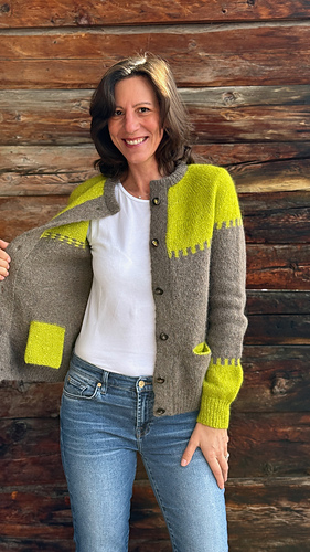 Le col replié, en côtes 1/1, est tricoté après relevage des mailles autour de l’encolure. Les poches, puis les manches, sont ensuite reprises et tricotées en rond, avec ou sans motif de couleur. L’ouvrage se termine par la couture des boutons.