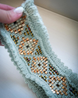 Crochet hook for cast on Use the same needle size, crochet hook for beading 0.60 mm, row counter (recommended), 1 stitch marker, tapestry needle.