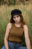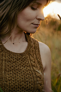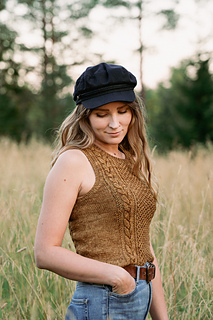 The top is worked top-down and features a cable pattern on the front and the back. First, the upper back is worked flat to the underarms and then stitches are picked up along the shoulders to work the upper front down to the underarms. The pieces are joined and the body is worked in the round to hem. Finally, the stitches are picked up around