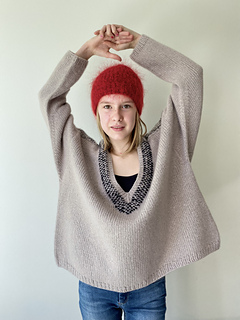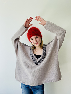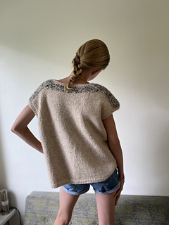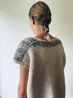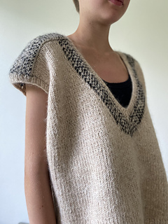Grafiet is a warm yet airy & light sweater/vest with marled colourwork details in the saddle shoulders, the deep V-neck and the upper back. The sweater/vest has an oversized, boxy shape. It is made in a fun and fascinating way: you start with rectangular pieces — the saddle shoulders — and build the whole sweater/vest from there, both flat and in the round. The sleeve and body lengths are easy to adjust.