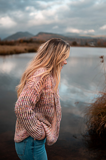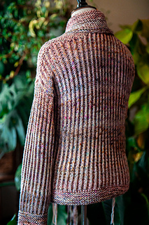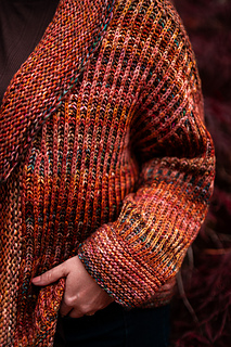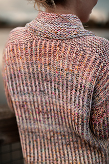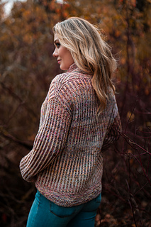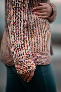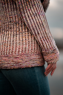 - Sleeves picked up and worked in the round in two color brioche, finished with marled garter cuffs, shaped for a tidy fit.