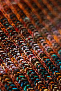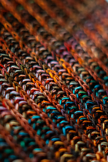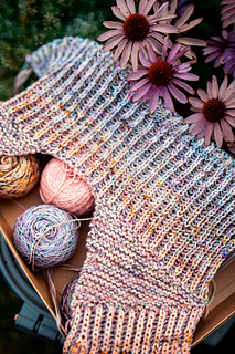 Worked in basic two color brioche with two strands of fingering weight yarn held together for both Foreground (FG) and Background (BG) colors, the marled effect comes from changing one strand at a time so colors blend and flow softly. Speckles and small leftovers shine here, creating gentle shifts and layered depth.
