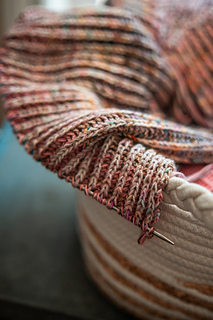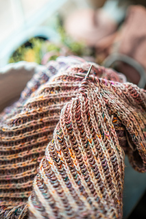 - Body worked flat in basic two color brioche, finished with a marled garter hem