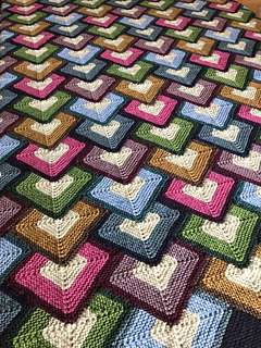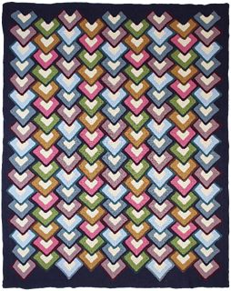 The blanket is constructed seamlessly using a modular approach—no sewing required. A Foundation of Twin Peaks and Corner shapes is worked first, with stitches held live. From there, layers of hearts are added directly to the blanket using a combination of pick up and knit (pu&k), knitting from stitch holders, and casting on new stitches. The hearts are worked in 33 layers, alternating between rows of five and four hearts, creating a staggered, tiled effect. The blanket is finished with picked-up edge pieces for a clean, integrated border.