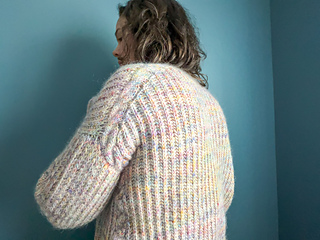 This cardigan is knitted with 2 threads held together, DK weight yarn + mohair lace yarn (Fiesta + Kid Silk from Drops) = Worsted weight.