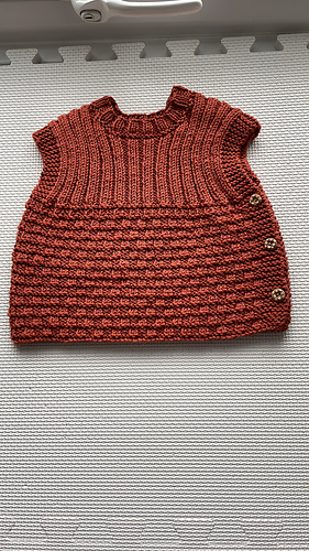 There is no shaping in the yoke. Instead, I have let the stitch pattern hug the baby’s body, resulting in relaxed comfort and a perfect fit. As the baby grows the rib will grow too, ending as a true waist-length tank top towards the end of its cycle.