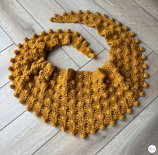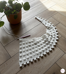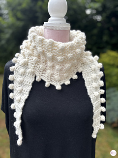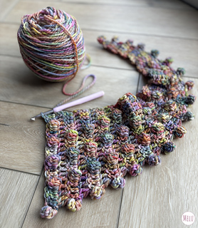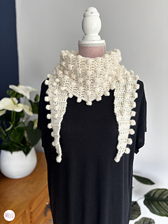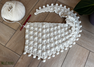 This side-to-side pattern starts small, grows steadily to the peak, and then tapers neatly back down again. And yes, the mini pom-poms are back! They’re worked directly into the edging, so unlike tassels or sewn-on pom-poms, you don’t need to worry about them coming off. They add a pretty, playful edging that gives the scarf a lovely snowball effect.
