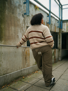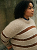 The front and back panels are then joined using additional cast-on stitches at the underarm. The body is worked in the round, continuing in Stockinette Stitch and striping. After completing the main body, you finish with ribbing for the hem. The sleeve stitches are picked up from the armholes and worked in Stockinette Stitch, striping and in the round. Once the sleeve decreases and desired length for the sleeves have been reached, the cuffs are worked in ribbing. Lastly, you work ribbing for the neckline, fold it in half and hand sew it the neckline.