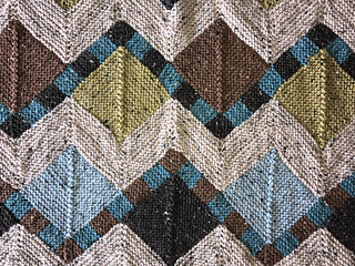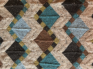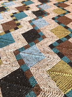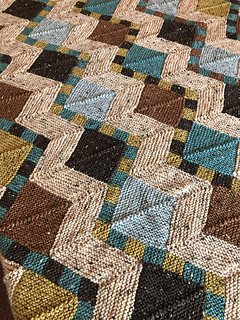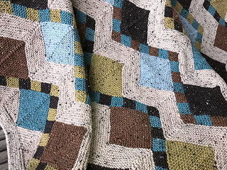 Each strip begins with a checkerboard “Ric Rac” motif, which sets the visual rhythm for the piece. From there, mitered squares and triangles are added, and the strip is gradually widened by picking up and knitting stitches along the edges. Finished strips are joined using 3-needle bind-off, eliminating sewing. Borders are worked last by picking up and knitting stitches around the perimeter of the blanket.