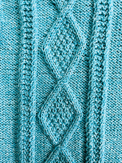 An all-season over-top featuring gently dropped shoulders. Elegant diamond panels are filled with moss stitch and framed on each side by narrow verticals of twisted stitches and slender garter stitch panels. A matching vertical runs down the centre front and back, creating a balanced, flattering silhouette with a nod to classic Aran styling. All edges are finished in simple single rib for a clean, refined look. Worked bottom up and with full written instructions.