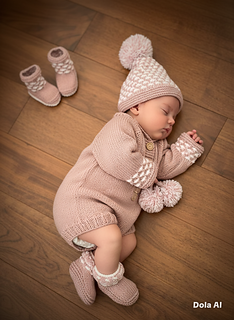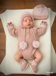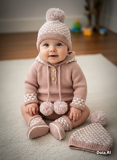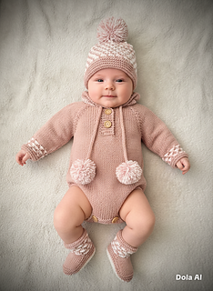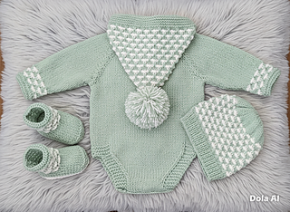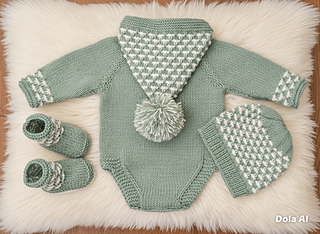 This hooded romper is knitted from the hood down, the textured hood design is a simple two-colour slip stitch that is easy to do. The pattern has line-by-line instructions for the complete set of Romper, hat, and booties.