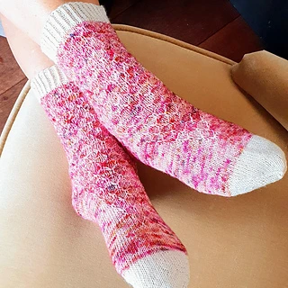 Honey is short for Honeycomb. Years ago I was fascinated by the ‘Mock Honeycomb’ pattern I found through Ravelry. Originally I found a pattern for a ‘discloth’ and later for gloves. Both can be found for free via Ravelry. I liked them so much that I incorporated them into a pattern for socks. Now I have this worked out for you because it is a very nice pattern for the type of yarn I usually dye. Even in multicolored yarns you can see the pattern very well and it is not really difficult.