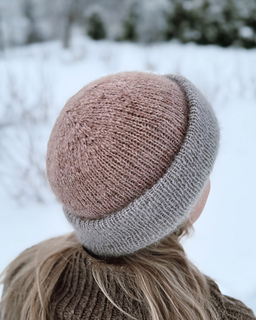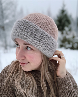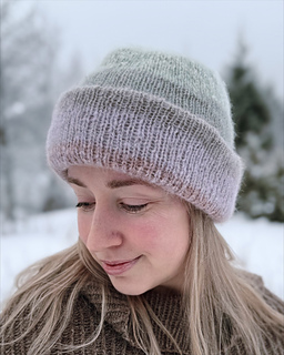 Höttö is a wonderfully light, fluffy and warm beanie. It’s worked with three strands of silk mohair, giving ample opportunities for colour play / fading. And it’s excellent for using up scrap yarns. The beanie is worked as long tube from crown increases to crown decreases. Once it’s finished, it’s folded double.