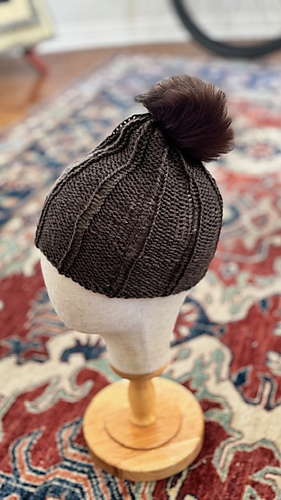 This beanie is one of the easiest to knit. Worked from the bottom up, in the round, just a single decrease round is worked in stitch pattern. There is no bind off, you just cinch the stitches together with a tapestry needle, secure and weave in ends, then for good measure, add a cute furry pom and you’re all done.