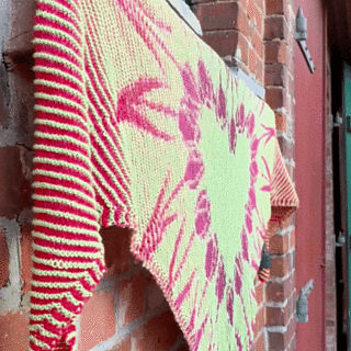 This wide scarf is knitted using the illusion knitting technique and shows a bouquet of tulips in a heart. The scarf measures approximately 200 cm x 78 cm.