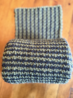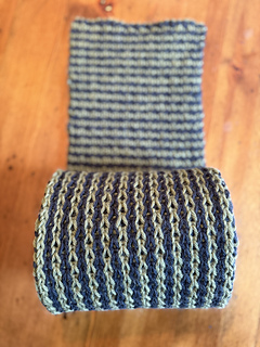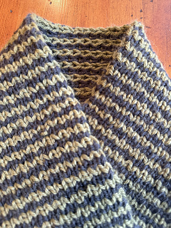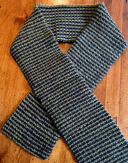 This is a slipped-stitch reversible double-knit scarf with horizontal stripes on one side and vertical stripes on the other.