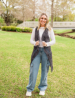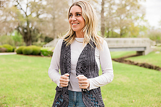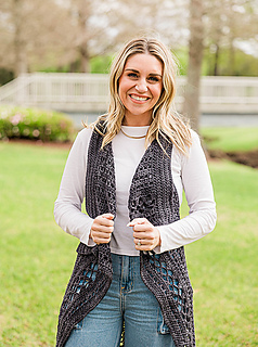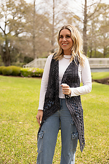 Model Shown is 5’2” wears size 4 clothing / modeling size small vest in Asylum Fibers yarn