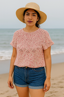 The tee has a seamless yoke construction and is worked from top to bottom. Once the yoke is knitted, the body and then the short sleeves are worked separately. At this point you can knit a few short rows to give more height to the back. The pattern consists of the following sections: