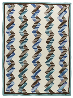 Intwined is a boldly graphic blanket built from interlocking, striped shapes that flow diagonally across the surface. Worked entirely in garter stitch, with one yarn color at a time, the design is formed from construction and color sequencing rather than stitch complexity.
