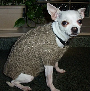 “Any dog will look just dashing in this modern version of a traditional cabled Irish Fisherman sweater. Knit with bulky wool, this heirloom sweater is a speedy introduction to cables. The neck and tail ends are left unribbed for an updated look on an old favorite. The seed-stitch panels on the side are more than an attractive feature; they allow the sweater to be knit with or without sleeves, while still maintaining a finished appearance. And don’t forget the matching fingerless gloves for you! The bulky cables are a nod to teh Aran Islands where the style originated, while the fingerless design allows you to hold your pup’s leash with ease.”