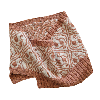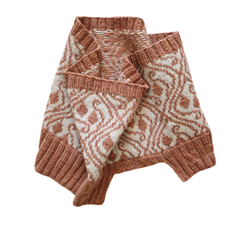 The cowl features a unique shape - a split border, accentuating the arm, is worked in ribbing and a couple of cables before transitioning into the stranded colorwork pattern. The top echoes the bottom rib.