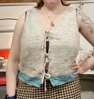 The Islander Vest is a cute tie front vest tank that is a perfect staple piece for layering or as a summer top! The vest is knit top down and worked flat for the entirety of the vest. It has a stockinette body with options for bust and waist shaping, and edging details with a section of broken rib and slipped edge stitches. It features a V neckline, and broken rib hem/I-cord bind off. It is a size inclusive design, written in 20 sizes, every 2 inches / 5 cm from 28-66 inches / 70-165 cm finished upper bust, with an easily customizable full bust. It is intended to fit with 2-4 inches / 5-10 cm of positive ease and sit at a cropped length (length can be altered to your preference).
