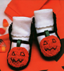 Ankle high open front booties embellished with embroidered pumpkins. Lacy picot edges.
