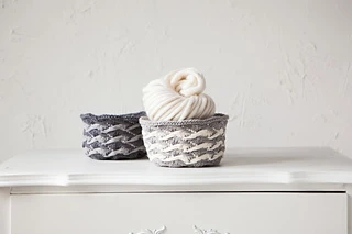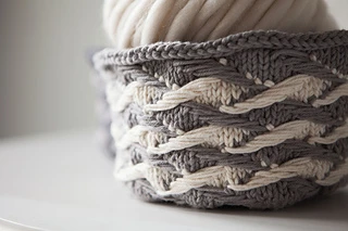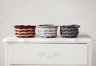Knit Picks’ Dishie yarn held double-stranded creates an extremely durable and stable, yet collapsible, basket. The seed stitch base provides a flat foundation for the basket; stitches are picked up from the base, and the jacquard pattern gently lofts upward to a slightly scalloped I-cord bound off top rim.