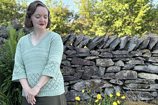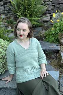 Jamieson is knitted in the round from the bottom up commencing with a decorative lacework section, before continuing in stocking stitch. Once the armholes are reached, the sweater is divided into front and back pieces and knitted back and forth. The shoulders are joined using the three-needle cast-off method and then the sleeves are picked up around the armhole and knitted downwards in the round. The neckline is knitted with an unusual i-cord edging that requires an additional DPN to be used and a second skein of yarn. A Moss (Seed) st panel is worked across the shoulders and a garter stitch edging alongside both armholes. The body and sleeves have false seams created by working a purl stitch at the seam points. A ballerina length sleeve as was typical of Spencers, finishes the look. All these added details provide real couture finishing touches to this beautiful piece.