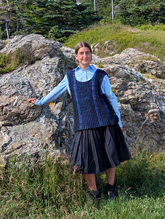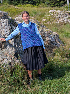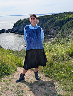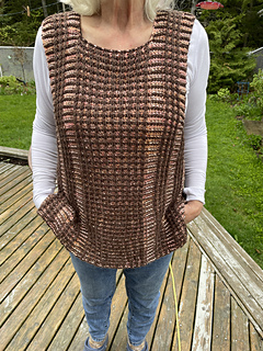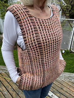 This two-in-one vest makes a great travel companion. On one side, vertical lines of stockinette stitches in the main color float on a garter stitch base, spots of the contrast color peeking through. Turn the vest inside out, and the vertical lines are in the contrast color, with spots of the main color peeking through. The magic comes from working flat on circular needles. You work 2 rows of a simple slip-stitch pattern with one yarn, push all the stitches to the other end of the circular needle, and work two slip-stitch rows from that side with the other yarn. The garter ridge bands that form the edgings and vertical insertions are worked as you knit the vest, so very little finishing is required.