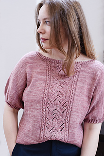 The upper front along with sleeves is worked back and forth, starting at the shoulder line. Shoulders are shaped, using short-rows. After front/sleeves completion, shoulder live stitches are used for each Right and Left back/sleeves. The pieces then joined and the lower body is worked in one piece to the lower edge.