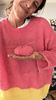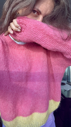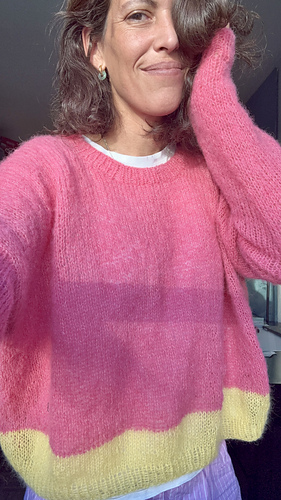 El jersey tiene una holgura positiva de unos 25 cm, pero puedes elegir una talla con menos holgura si prefieres que te quede más ajustado. Si este es tu caso, te recomiendo que te fijes si el contorno de la sisa de la talla elegida se ajusta a tu medida cómodamente (no puede quedar demasiado justo o te molestará un poco). El jersey de la foto es la talla 3 para un contorno de pecho es de 86 cm. El patrón especifica 1/2/3/4/5/6/7 tallas distintas.