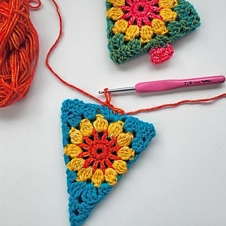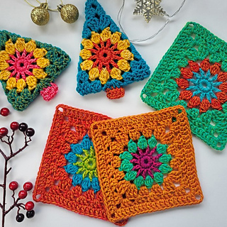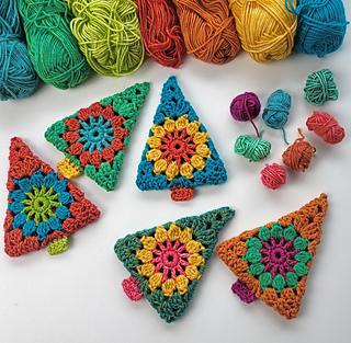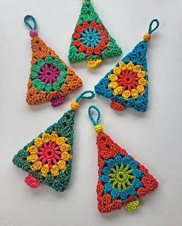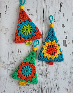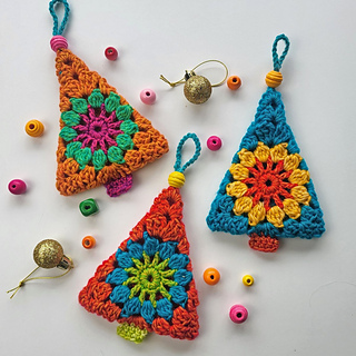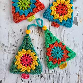 The bright, cheerful centre resembles a festive bauble, while the simple folding technique transforms a crochet square into a charming tree.