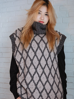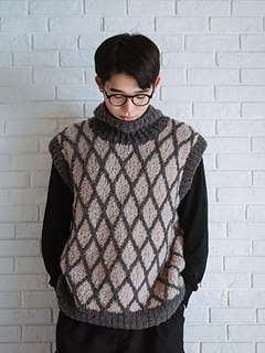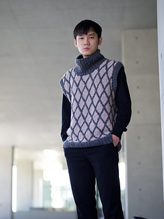 This vest is inspired by city landscape and architecture with modern geometric patterns. It utilizes stranded colourwork and 1/1 cables to convey the image of a city building with big glass windows framed by clean steel lines.