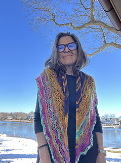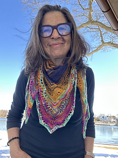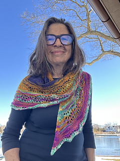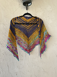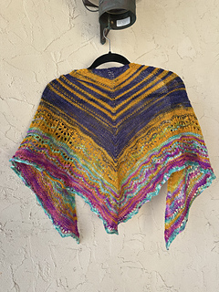 This simple triangle pattern starts out with top-down garter/stockinette knitting. Then changes over to an interesting lace pattern that adds extra stitches on right side row and removes them on wrong side row.
